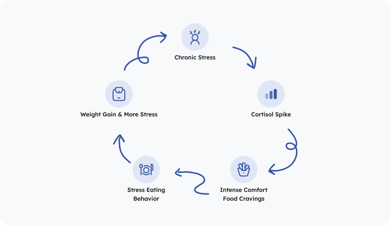 Chronic Stress → Cortisol Increases → Comfort food cravings intensify → Stress eating becomes habitual → Weight gain increases → Stress about weight triggers more eating[10]